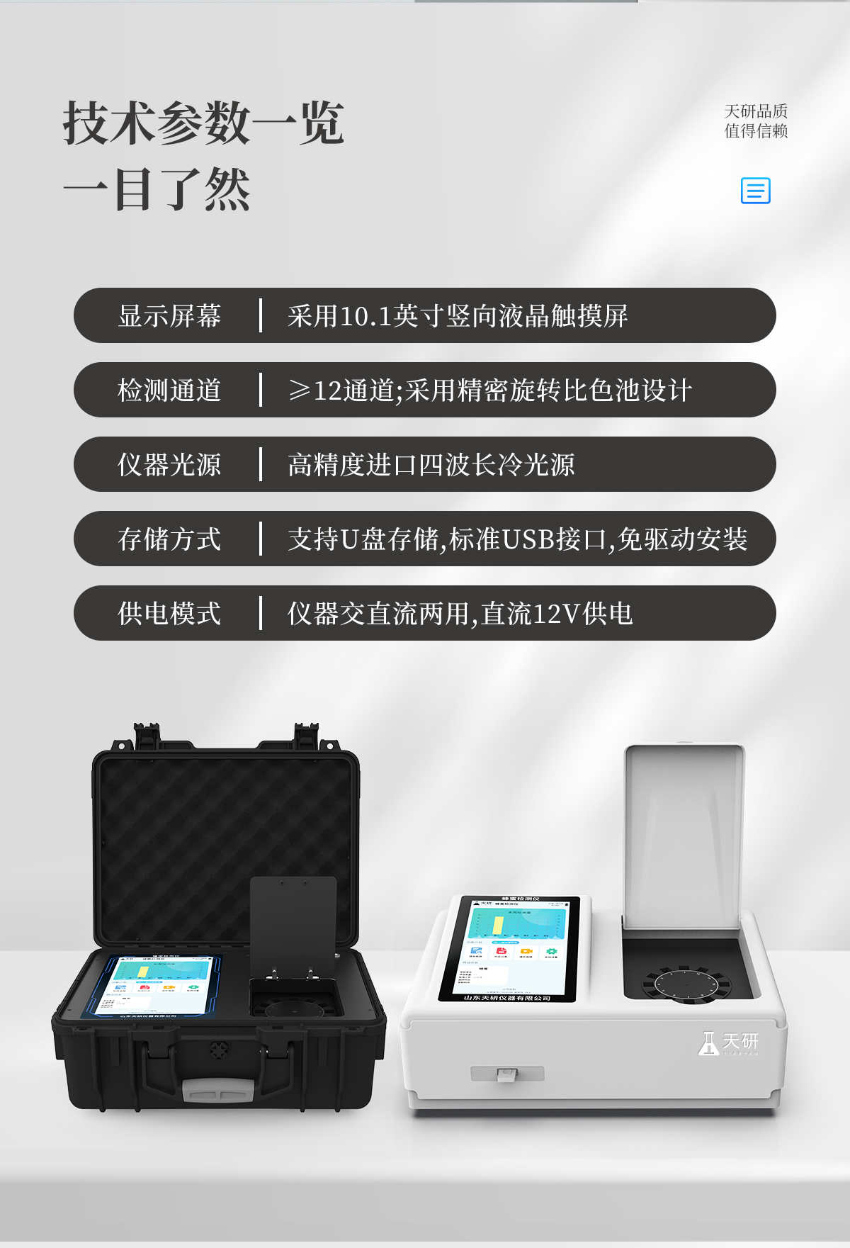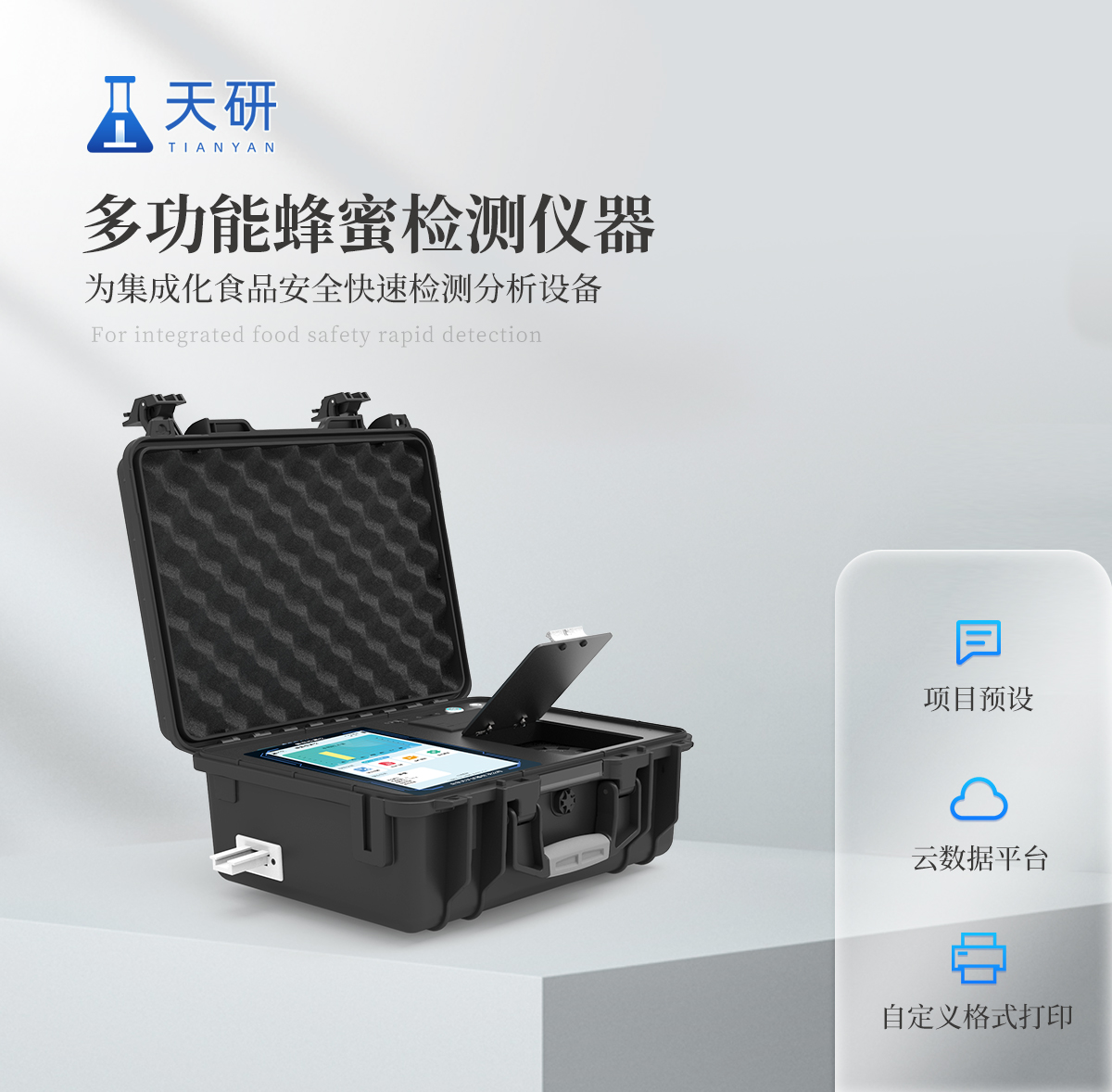 | 儀器采用手提式一體化系統檢測技術,將分光光度模塊、膠體金檢測模塊、新型農殘檢測模塊、數字化管理模塊、無線通訊模塊高度集成于一體,支持檢測200種食品安全檢測項目,同時預留升級檢測方法。 | 儀器檢測模塊標準化、智能化,可隨意自由組合。檢測箱體內置多個標準檢測單元,檢測模塊可以調整配置。 | 儀器采用全新安卓智能系統,主控芯片采用 ARM Cortex-A7,RK3288/4核處理器,10.1寸高清液晶觸摸豎屏,更加**的UI交互界面,運轉快捷;儀器配備無線通信模塊: 4G(APN)通訊模塊、Wifi模塊,藍牙傳輸,同時具有雙USB接口以及RJ45接口能以多種方式實現數據保存和數據傳輸功能。 | 創新檢測模式:★檢測通道:≥12通道;采用精密旋轉比色池設計,使用同芯片同光源校準精度,解決不同光源之間的誤差值。1-12通道間誤差0.1%。(**號:ZL202022821055.2) | ★儀器具有自動識別比色皿檢測功能,即:將樣品比色皿放入儀器后,點擊樣品檢測,儀器自動識別比色皿進行通道檢測。 | 進口高精光源: | 高精度進口四波長冷光源,通道配置 410、520、590、630nm 波長光源,一個光源芯片驅動一個光源,誤差極小,每臺設備單獨**校準光源,**比對,同時參照四種不同波段光源全方位覆蓋市面上99%的農殘食品項目檢測。 | 膠體金模塊檢測方式:★采用COMS實時成像技術,單金標實時讀卡,通過不同顏色的灰度變化,一秒精準得出結果。 | 智能操作分析系統:★便捷操作系統:設備檢測時可在同一檢測界面自動對應相關檢測通道一次性選擇1-12個樣品名稱,無須退出界面,節省操作時間。 | ★數據集成系統:設備首頁自動統計檢測數據包含:周檢測數據、月檢測數據,全部檢測總數量,均包含檢測總數,合格數,不合格數,以及相關柱形分析圖,對各項檢測數據清晰掌握,無需電腦查詢,更加快捷直觀。 | ★項目預設系統:支持添加單個及多個相同或不相同的任務預設,一鍵快速調取,每一個任務分別可以設置不同的樣品、批次、編號、來源、備注、抽樣信息、檢測信息、受檢信息、復核信息等更多信息。無縫鏈接平臺和APP實時查看下發任務。 | ★數據監管系統:同步對接監管平臺,數據可局域網和互聯網數據上傳,檢測結果可選擇直接傳至食品安全監管平臺。集成OSS輸出存儲服務、區分設備定向管理應用,進行區域食品安全監管及大數據分析處理與數據統計,檢測區域食品安全長短期動態,達到食品安全問題預估、預警。 | ★自定義打印系統:內置全新打印系統,新創自定義打印方式,可按需靈活設置開啟或關閉:產品合格證(國家農業部標準要求),二維碼,抽樣信息、檢測信息,受檢信息、復核信息、抽樣日期、檢測日期等信息的打印。 | ★系統遠程更新功能:可定向分客戶分儀器更新系統,按照不同客戶后期實際需求添加項目,無需機器返廠,即可遠程實時升級全新系統,節省時間成本及避免運輸造成設備損壞。 | 儀器主機采用一體化防水、抗壓、防撞擊、防腐蝕箱體設計,同時配備交直流供電,可連接車載電源,可選配大容量充電鋰電池,滿足現場野外檢測需求。 | 安全證書,放心保障:儀器具有中國計量科學研究院校準證書,**認證。 |