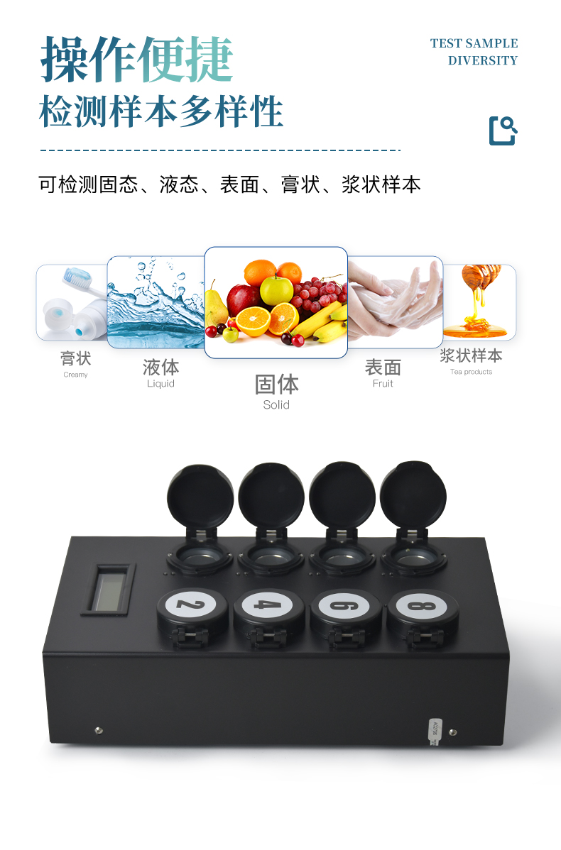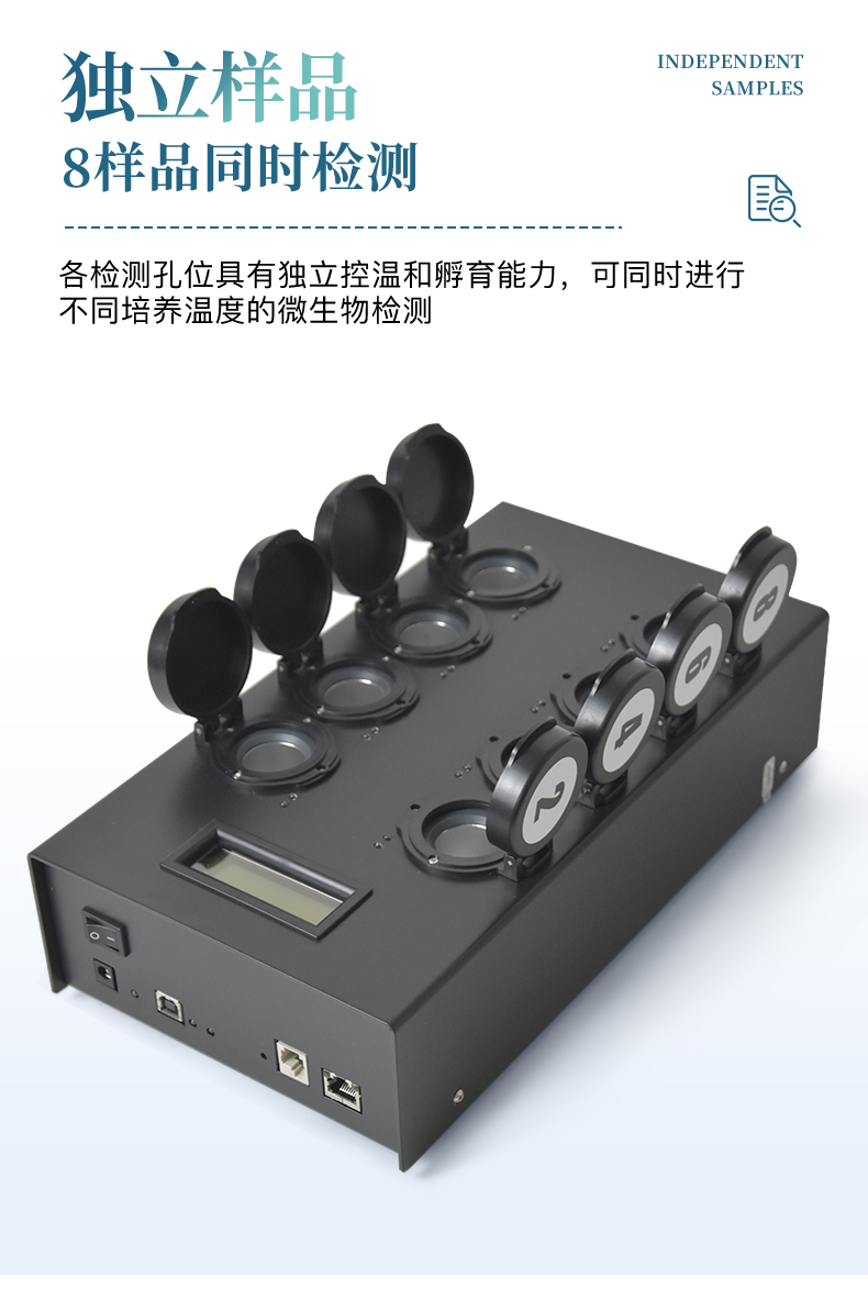 4、 檢測樣本只需1ml/1g;同一溫度下可同時檢測8個樣品;