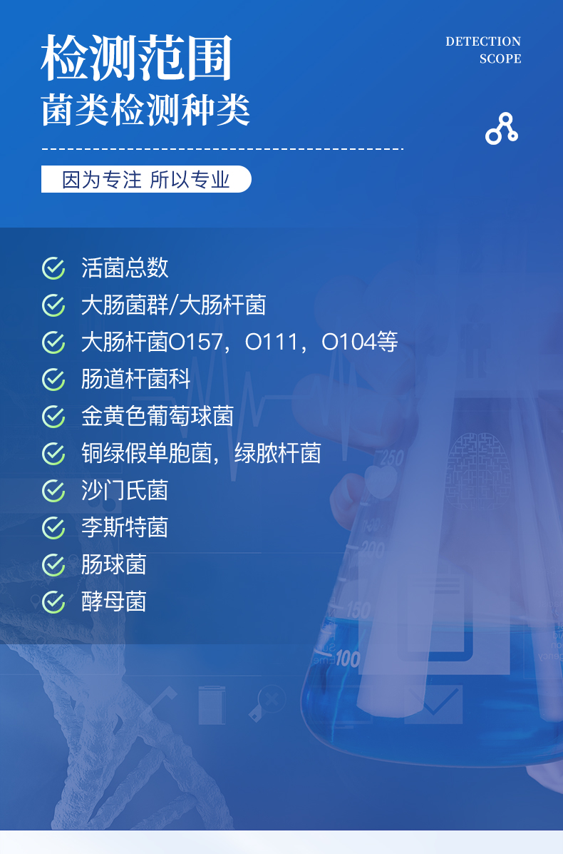 | 活細菌總數 :大腸菌群/糞大腸菌群/大腸桿菌/大腸桿菌O157, O111, O104...等 | 腸道桿菌科 :金黃色葡萄球菌 銅綠假單胞菌;綠膿桿菌 沙門氏菌 李斯特菌 腸球菌 酵母菌 |