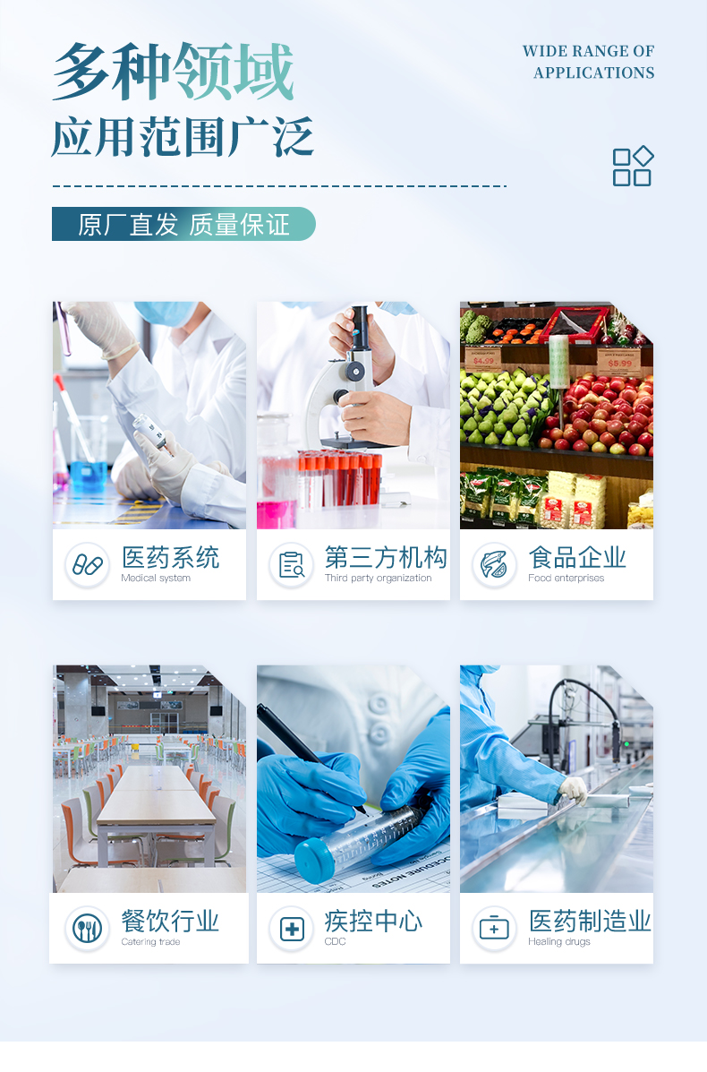| 衛生控制: -食品(HACCP) -廚房、工具、表面(HACCP) -水質 -(CDC)疾病控制、進出口檢驗檢疫 -藥品及 化妝品 | 與我們的生活息息相關,例如: 咖啡館、餐廳 ,水源檢測、制水廠 ,分析實驗室和HACCP診斷 ,農產品及相關加工公司 ,藥廠、藥房、化妝品廠 ,環境監測機構 ,水配送公司 ,消費者保護團體、工商管理機構 ,室內空調調節公司 | 集傳統檢驗方法優點于一身:培養皿法、 酶法(β-葡萄糖苷酸酶分析)、 -免疫法(抗原搜尋)、基因法(基因搜尋) | 檢驗樣本無需任何前處理 :-液態樣本,固態樣本和表面樣本均無需前處理 ; | 定性和定量分析 :-搭配檢測機:100%的定量分析 、肉眼判讀:定性或半定量分析 ; | 簡單便捷 :簡單的三個步驟得到檢測結果 ; | 檢驗迅速 :是傳統檢驗方法速度的2~5倍 ; | 高靈敏性:可以檢測到1目標微生物(理論極值); | 高特異性 :特異性高達99.999%(理論極值) ; | 檢測瓶就是實驗室 :微生物檢測瓶隨時可用、未受過嚴格專業訓練的檢測人員也可隨時隨地進行檢測 ; | 使用后安全丟棄 :和過期藥物同樣處理 ; |